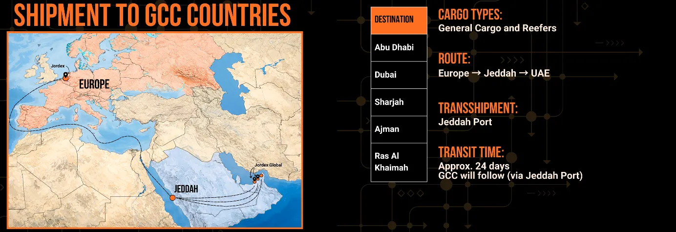 Given the current restrictions in the Middle East, we are looking at alternative routes. Below, you’ll find an example of what we can offer. Thanks to our own offices in the UAE with a customs license, we can provide this solution directly for you. For more information or if you’re interested, you can contact our sales department at sales@jordex.com.